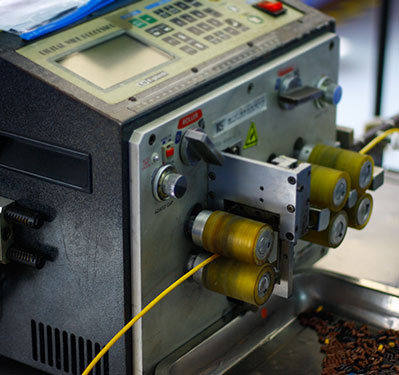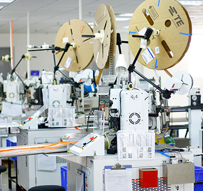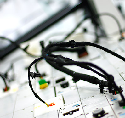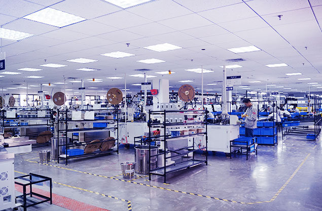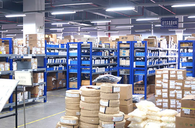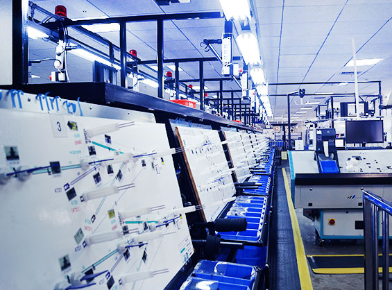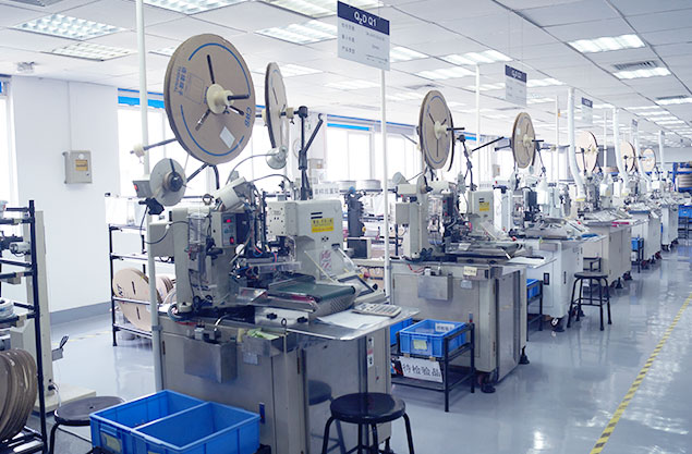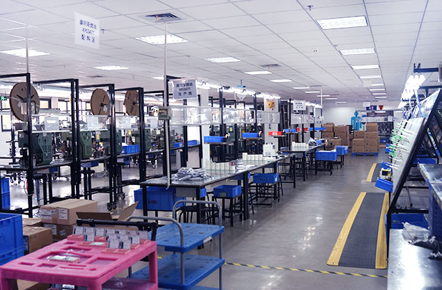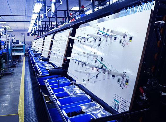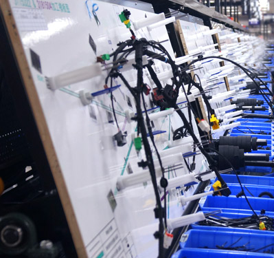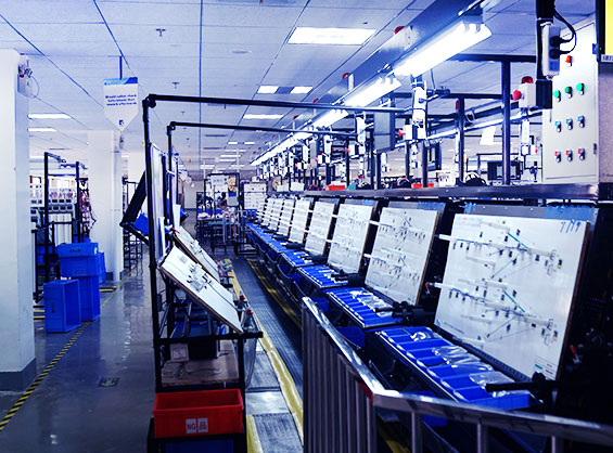 车间配有全自动装配生产流水线,有专业非标定制的线束图板装置;图板上标示有布线路径且配置有布线夹具,通过沿着布线路径进行布线来装配线束,能够满足快速更换产品型号的需要。