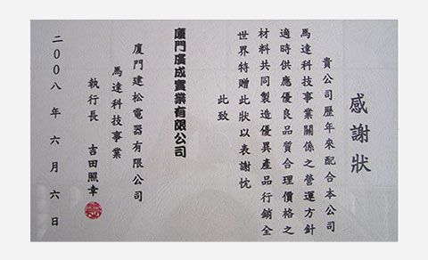 2008On June 6th 2008,Macro-s was honored to gain a certificate of appreciation from Mangxiang Panasonic, Xiamen -